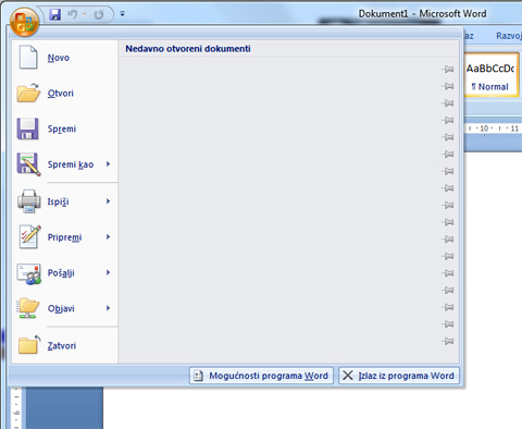 U desnom dijelu okvira koji dobijemo kad kliknemo na gumb Office vidi se popis nedavno otvorenih datoteka, a u doljnjem se nalaze 2 gumba, jedan za dodatne mogućnosti programa, a drugi za izlaz programa.
