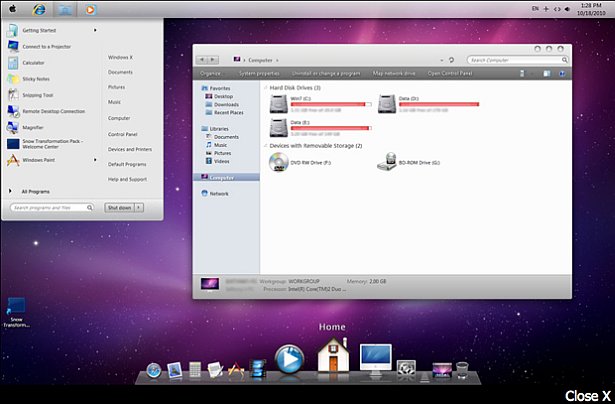 Ova aplikacija izmijenit će vaš ekran dobrodošlice (eng. welcome screen), vizualni stil, sliku radne površine, zvukove, reakcije prozora i mnoge druge stvari tako da sliče na Mac OS. Kada vam počne nedostajati vaš Start gumb, jednostavno deinstalirajte ovu aplikaciju.