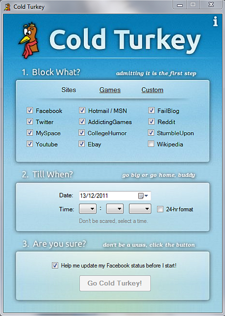 Cold Turkey je besplatan, open source program koji vam omogućuje privremeno blokiranje popularnih društvenih mreža i online igara, odnosno svih web stranica za koje smatrate da vam oduzimaju previše vremena i uznemiravaju vas u radu.