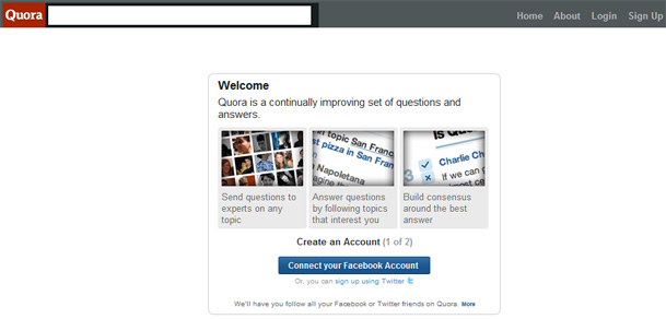 Na samu stranicu se zatim možete prijaviti preko svojeg Twitter ili Facebook računa. Ovisno sa kojeg računa se prijavite, Quora će vam ponuditi kratko popunjavanje svojeg profila, umetanje vaše slike i vašeg imena i odabir lozinke, a sam proces je vrlo brz.