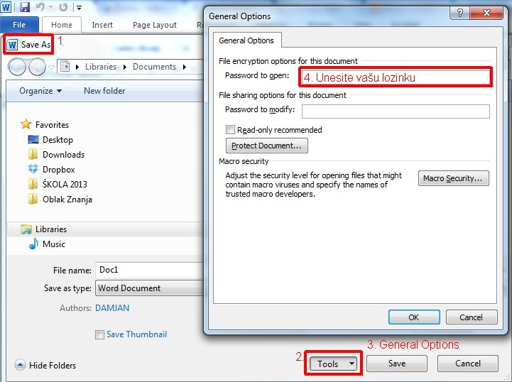 Kod Worda 2007 i 20120 do kartice Security možete doći tako da prilikom spremanja dokumenta (Office gumb -> Spremi kao (Save as)), pokraj gumba Save kliknete na gumb Tools i odaberete General Options. U polje Password to open, unesite svoju lozinku i ponovno je unesite kada se to od vas zatraži. Na kraju sve skupa potvrdite, spremite svoj dokument i nemojte zaboraviti vašu lozinku.