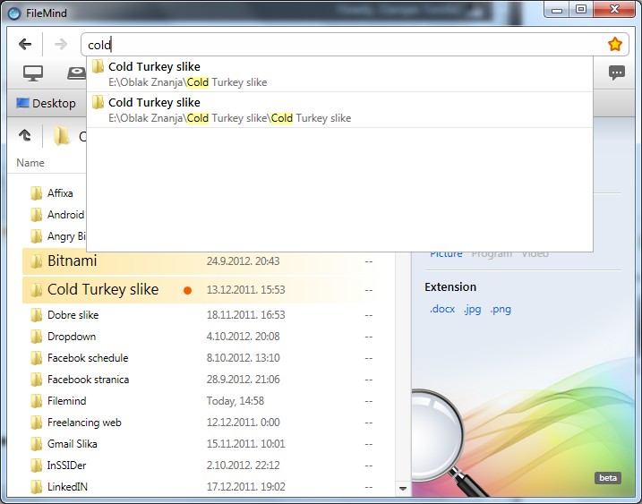 Ono što nam odmah upada u oko je opcija pretraživanja datoteka po njihovim proširenjima. Pomoću Filemind aplikacije možete brzo pretraživati odnosno filtrirati rezultate po Datumu, Vrsti dokumenta i proširanju. Primjerice, ako s desne strane kliknete na proširenje .jpg, FileMind će filtrirati sve jpg datoteke u trenutnoj mapi.