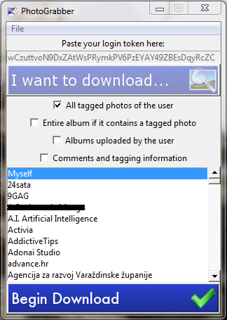 Kliknite na I want do download (želim preuzeti). PhotoGrabber će sada prikazati popis svih vaših prijatelja, uključujući i vas. Za preuzimanje svih slika označenih sa svojim imenom odaberite sebe (Myself) i kliknite na gumb za početak preuzimanja (Begin Download).
