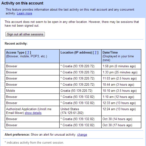 Ako postoji aktivnost s druge IP lokacije koja vam nije poznata možda ste se zaboravili odjaviti na javnom računalu. U tom slučaju koristite gumb Sign Out All Other Sessions kako bi ih prisilno zatvorili.