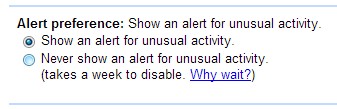 Za provjeru kliknite na Alert preferance na dnu prozora za aktivnost. Ako je upozorenje onemogućeno, kliknite na “Upozori me na neobičnu aktivnost” (Show an alert for unusual activity).