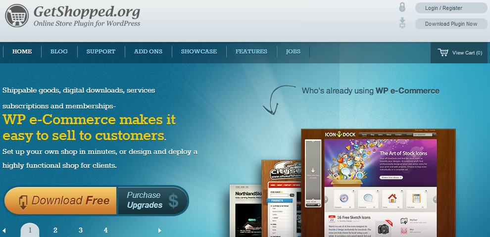 S više od 1,5 milijuna preuzimanja, WP E-commerce je najpopularniji e-commerce WordPress dodatak na tržištu. Jednostavan je za instalaciju i lako se može koristiti sa bilo kojom WordPress temom. Pruža široku paletu mogućnosti plaćanja kao što su čekovi, PayPal i slično. Vrlo je prilagodljiv i vrlo lako možete mijenjati njegov izgled ili odabrati predložak po vašem izboru.