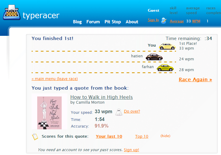 Typeracer je popularna onlina igra tipkanja koju možete igrati uživo i natjecati se s drugim korisnicima u tipkanju raznih citata iz knjiga, filmova i pjesama.