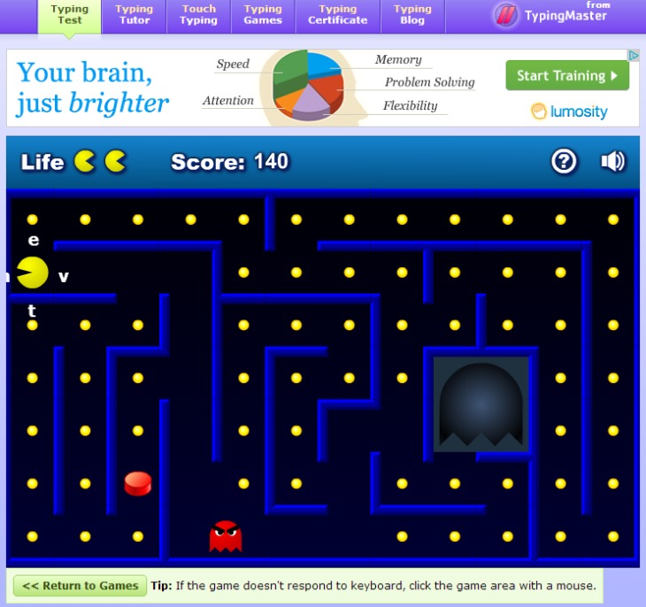 TypingTest vam nudi besplatne online testove tipkanja i online igre. Aplikacija će vas naučiti kako da brzo tipkate i testirate svoju brzinu tipkanja. Uz pomoć ovih lekcija također možete poboljšati svoje vještine tipkanja na ekranima na dodir. Mi smo za probu zaigrali igru Pacman gdje se  svaki put pokrećemo drugim slovima.