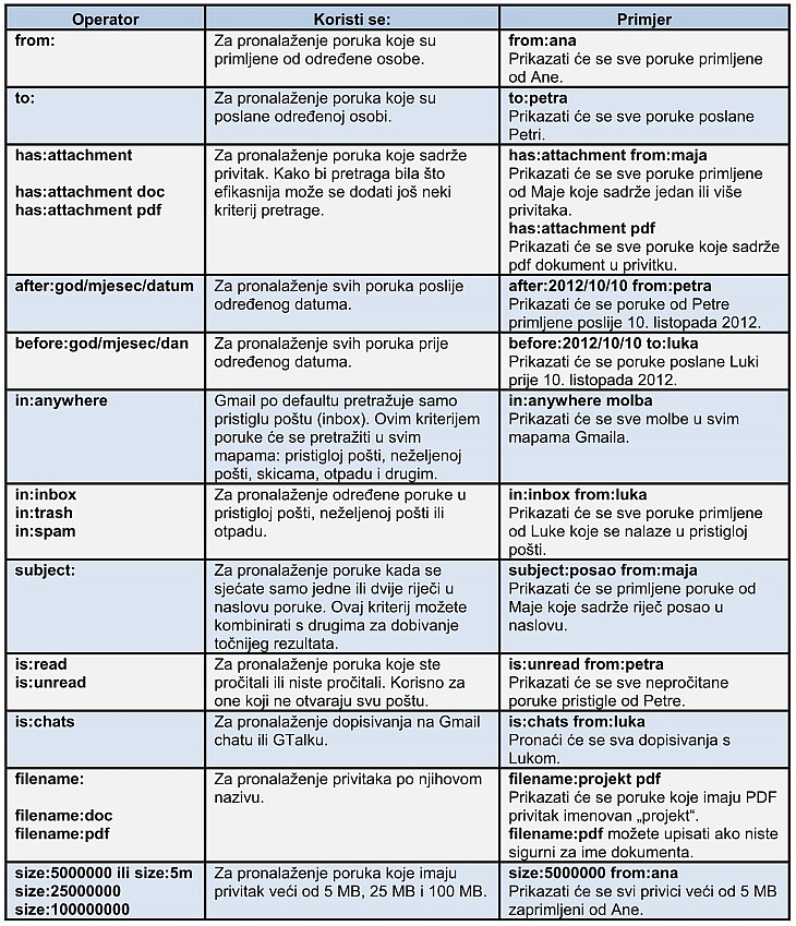 Evo nekoliko praktičnih operatora koji će vam pomoći kod pretraživanja Gmail pošte: