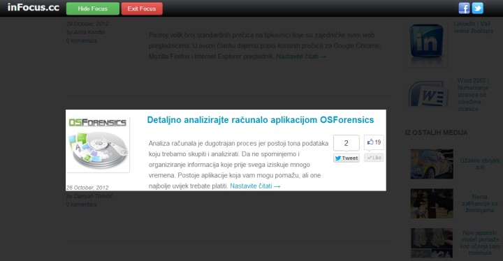 InFocus je web servis koji pomaže istaknuti određene dijelove web stranice pomoću osvijetljenog pravokutnika. Posjetite InFocus stranicu i unesite URL stranice na kojoj želite istaknuti najbitnije informacije. Kada se web stranica učita koristite miš za prilagodbu pravokutnika. Smanjujte ga i proširujte po želji.