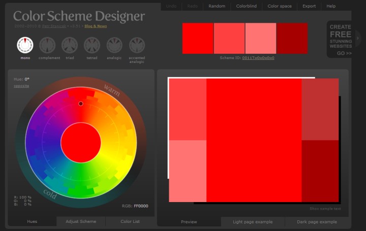 Color Scheme Designer je online alat za boje koji omogućuje jednostavan izbor boja za vašu web stranicu ili blog. Odlučite o shemi boja koje želite za svoju stranicu i na temelju toga izaberite boje iz kotača boja. Svaka pojedinačna boja predstavlja primarne boje i njihove komplementarne boje. Za dobivanje boljeg dojma o izabranim bojama koristite pregled (Preview) te ih prilagodite prema tekstu, svijetlim i tamnim pozadinama.