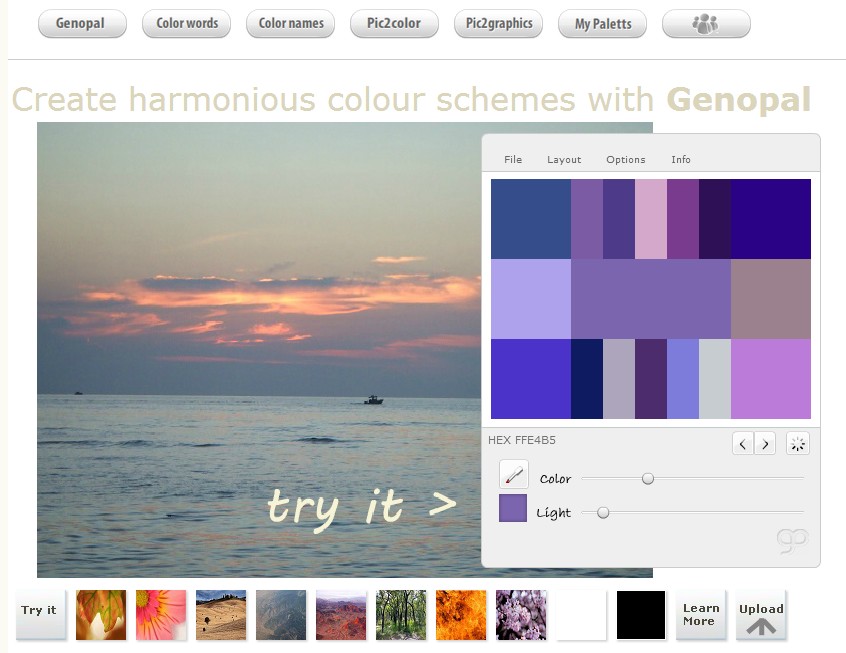 Kao i prošli web alati, Genopal daje dizajneru izbor alata kao što je alat za stvaranje paleta boja od slika i riječi. Zabavan i zanimljiv alat je onaj za ponovno bojenje koji omogućuje mijenjanje boja učitanih slika. Na primjer, Pic2graphics omogućuje prijenos „raspona boja“ između dviju slika.
