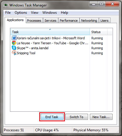 Miš pozicionirajte na alatnu traku, desni klik miša i odaberite Upravitelj zadataka (Start Task Manager) -> kliknite karticu Programi (Applications), zatim program koji ne reagira i potom Završi zadatak (End Task).