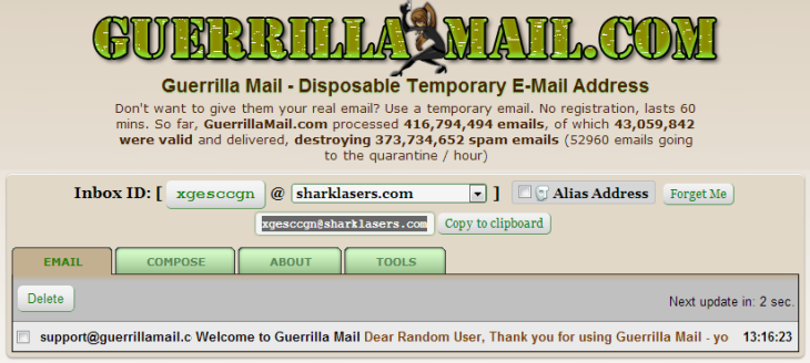 GuerrillaMail je više od jednokratne e-mail adrese. Adresa GuerrillaMaila nikada ne istekne. Kako bi počeli koristiti GuerrillaMail sve što trebate učiniti je odabrati svoje korisničko ime koje će biti vaša e-mail adresa. Možete odabrati ime koje želite i birati između sedam različitih domena. Možete odgovarati s GuerrillaMaila, pa čak priložiti i datoteke. GuerrillaMail filtrira neželjenu poštu (spam), a sva pošta briše se u roku od jednog sata.