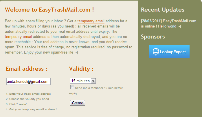 EasyTrashMail ima malo drugačiji pristup jednokratnoj e-pošti. Da bi usluga radila potrebno je dati svoju pravu e-mail adresu, a sve poruke poslane na jednokratnu adresu automatski se prosljeđuju na redovnu pristiglu poštu (inbox). Vi usluzi dajete vašu stvarnu e-mail adresu i odabirete koliko vremena želite da vaša jednokratna adresa traje. Postoje mnoge opcije, u rasponu od 15 minuta do 1 mjesec. Nakon što kliknete na “Create” dobit ćete nasumičnu e-mail adresu na easytrashmail.com i dok traje, sve što je poslano na nju dobit ćete izravno u svoj pravi poštanski sandučić (bez otkrivanja vaše stvarne adrese).