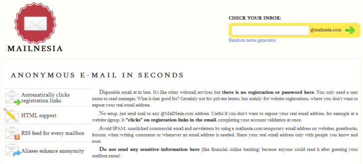 Mailnesia je slična GuerrillaMailu i MailCatchu u tome što nikada ne istekne, samo briše poštu, a e-mailu možete pristupiti svojim korisničkim imenom. I ovdje možete postaviti pseudonim za svoj inbox, tako da ne morate davati pristup svima koji vide vašu adresu. Mailnesia dolazi u devet različitih jezika, ima potpunu HTML potporu i auto klik na aktivacijske poruke. To znači da ako koristite ovu adresu za prijavu na uslugu ili web stranicu, Mailnesia će automatski kliknuti na link za potvrdu, bez da vi radite išta.