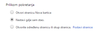Kliknite na Chrome izbornik u alatnoj traci desno i odaberite opciju Postavke. Odmah na početku dijela Prilikom pokretanja odaberite opciju Nastavi gdje sam stao.