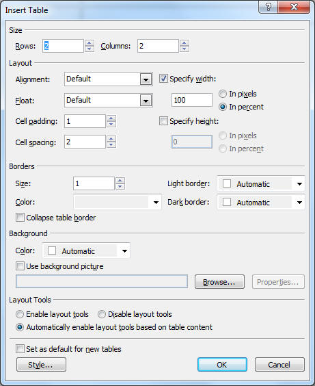 Tablicu možete umetnuti rabeći gumb za umetanje tablice (Insert Table) iz alatne trake Standard ili iz izbornika Table > Insert > Table. Nakon dodavanja tablice rabeći naredbu iz izbornika otvara se dijaloški okvir Insert table.