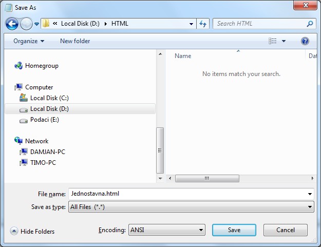 Spremimo dokument tako da u izborniku kliknemo na Datoteka > Spremi kao (File > Save as), a zatim pod opcijom Naziv dokumenta (Filename) upišemo Jednostavna.html, pod opcijem Save as Type odaberemo Sve datoteke (All Files).