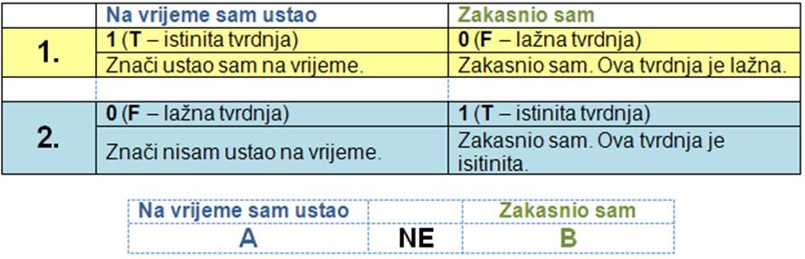 Ako je prva izjava istinita (1) druga će izjava biti lažna(0) i obrnuto.