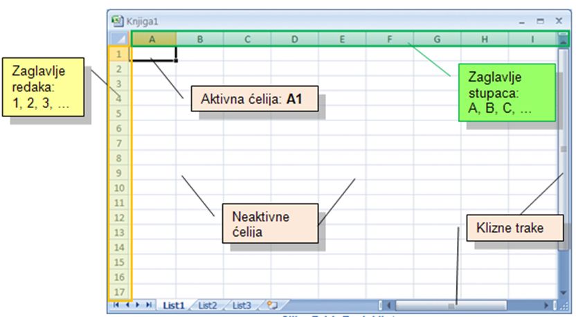 Zaglavlja redaka i stupaca – sadrže nazive redaka i stupaca. Stupci su označeni slovima od A do IV, a redovi brojevima od 1 do 65536.