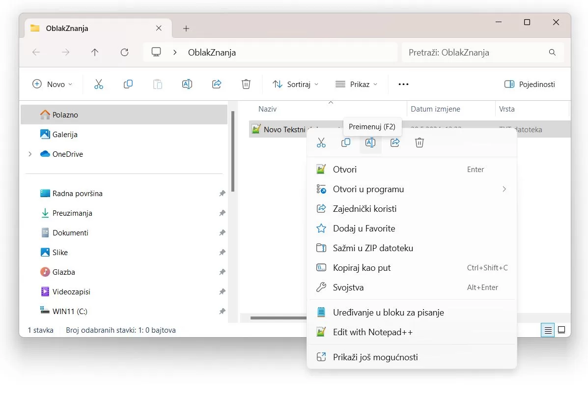 Preimenovanje datoteke u WIN 11 iz kontekstnog izbornika alatne trake