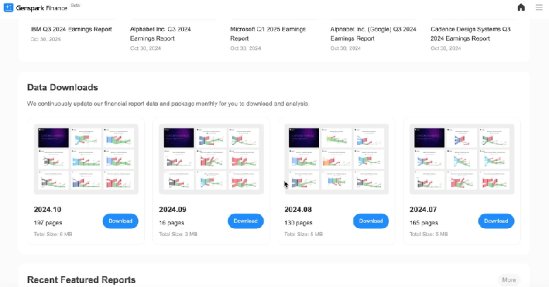 Kako bi dodatno poboljšao pristupačnost, Genspark također nudi besplatne pakete financijskih podataka. Ovi PDF-ovi koji se mogu preuzeti pružaju vizualne analize izvještaja o dobiti više od 100 velikih tvrtki, omogućujući korisnicima da s lakoćom prate prihode, troškove i dobit.