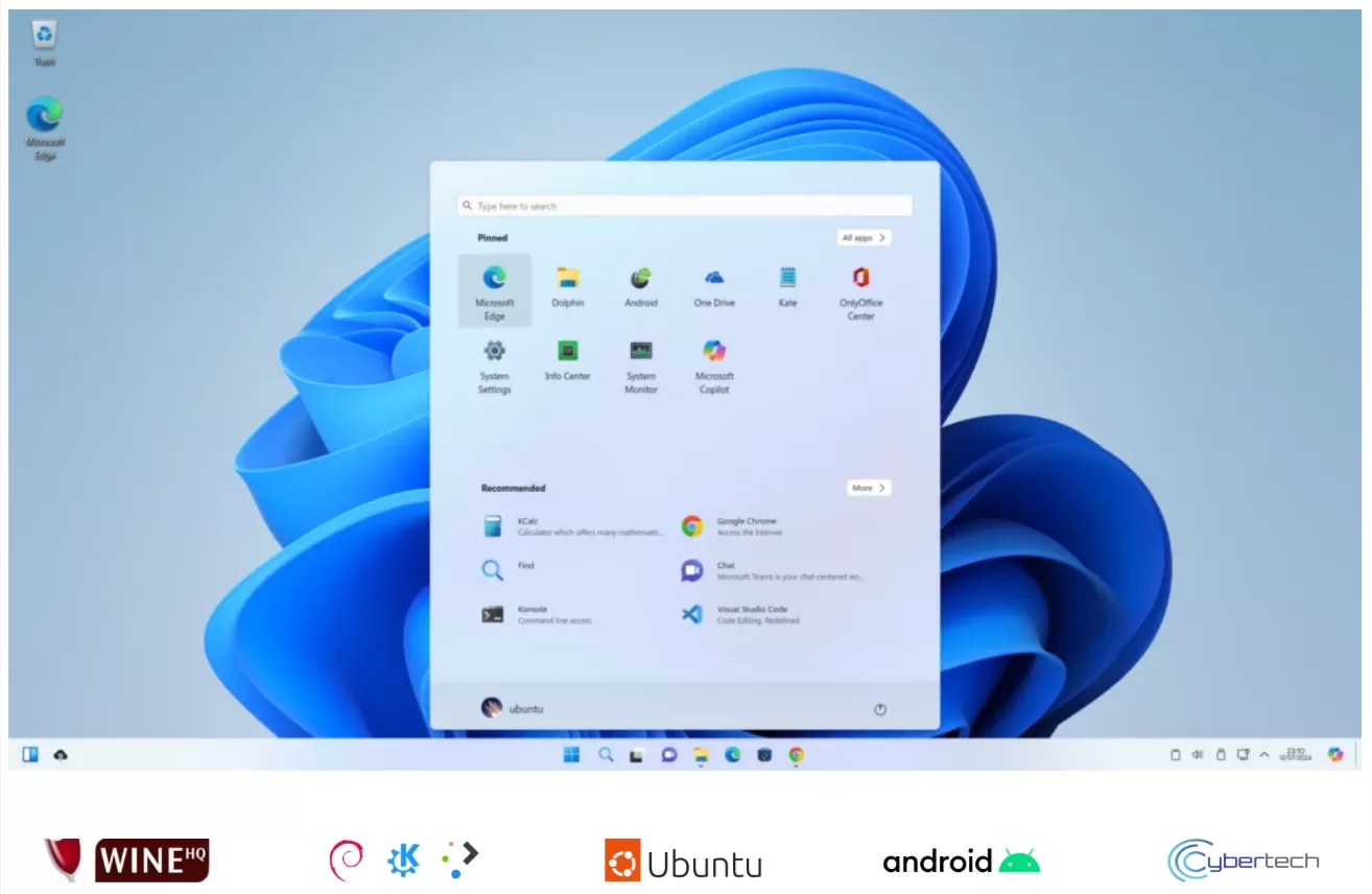 Wubuntu je jedna od takvih distribucija, očito dizajnirana da oponaša Windows 11. Distribucija se temelji na Ubuntuu i koristi KDE Plasma kako bi postigla uvjerljivu imitaciju Windowsa 11. Na radnoj površini nalaze se aplikacija za vremensku prognozu, bočna traka, izbornik, pokretač naredbi, favorit, programska traka i Copilot. Početne postavke omogućuju korisnicima odabir teme i prilagodbu izgleda.