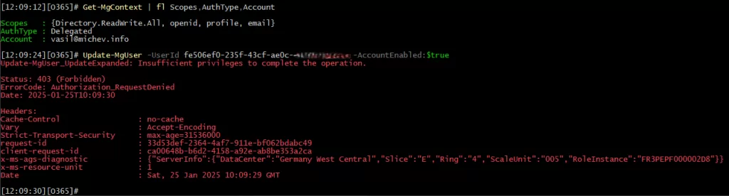Ispitajmo jednostavan scenarij koji će ilustrirati slučaj upotrebe za ta nova dopuštenja, kao i istaknuti razdvajanje od sveobuhvatnog Direktorij.accessasuser.all (aka predstavljati) opseg. Recimo da želimo blokirati korisnički račun određenog administratora, možda zato što je napustio tvrtku. Za obavljanje ove operacije putem dozvola za delegat, do sada je korisnik koji je izvršio radnju zahtijevao gore spomenuti opseg laganog predstavljanja, kao čak i Direktorij.readwrite.all Dozvole nisu bile dovoljne sami.
