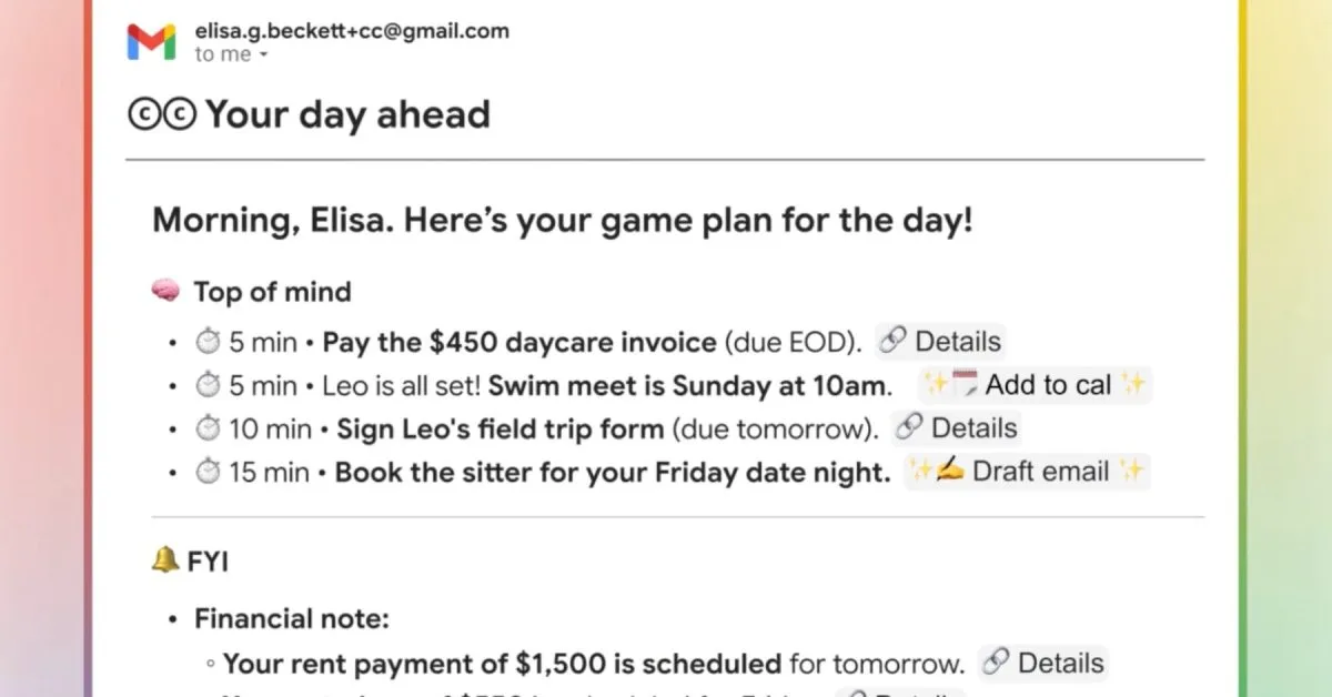 Google Labs otvorio je listu čekanja za svoj najnoviji eksperiment, CC. CC pokreće Gemini, a nakon što mu dopustite pristup vašem Google računu, počet će rezimirati vaš nadolazeći dan i slati vam dnevnu e-poštu sa svime što imate na dnevnom redu. A pod svime mislimo na sve. Podsjećat će vas na sastanke, dospjele račune i još mnogo toga.
