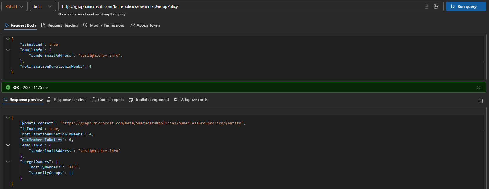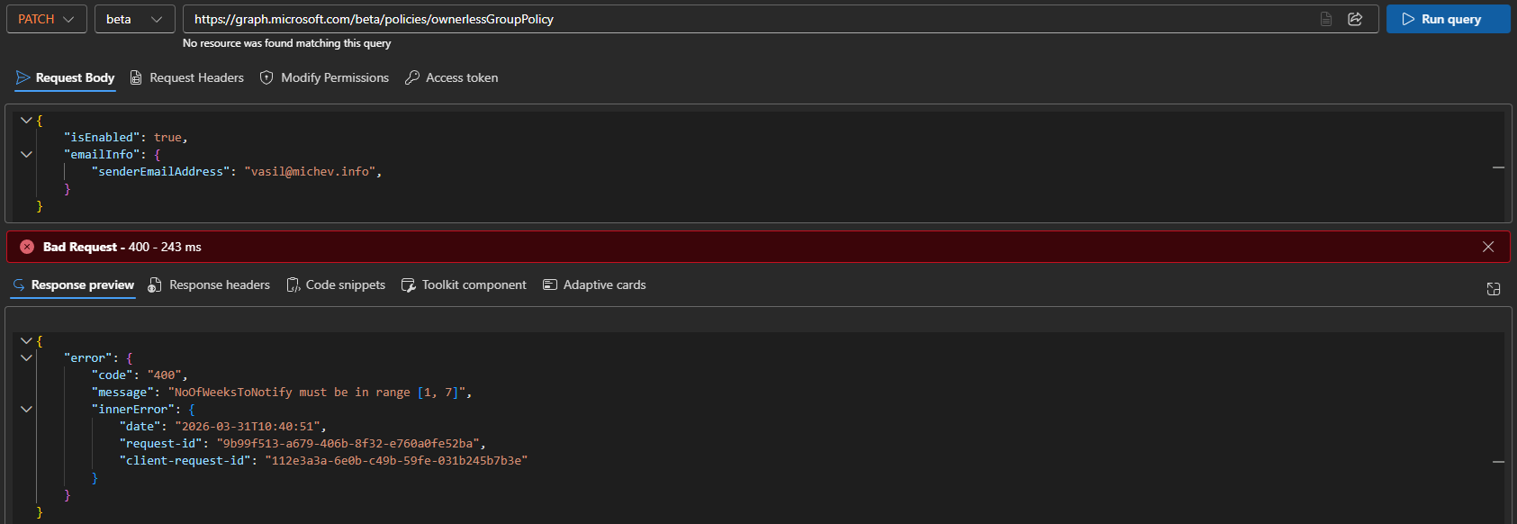 Na gornjoj snimci zaslona poruka o pogrešci odnosi se na nepostojeći NoOfWeeksToNotify parametar. Ovo je doista ono što je koristila “stara” implementacija Admin API-ja, s parametrom koji je sada preimenovan u notificationDurationInWeeks. Slično ponašanje može se uočiti i kod drugih “parova” parametara, tj MaxMembersToNotify/MaxNoOfMembersToNotify. Nije tajna da su mnoge Graph API implementacije jednostavna proxy usluga, a primjeri kao što je gornji jednostavno nam omogućuju da zavirimo iza zavjese. Kao i $što ako parametar što se toga tiče: