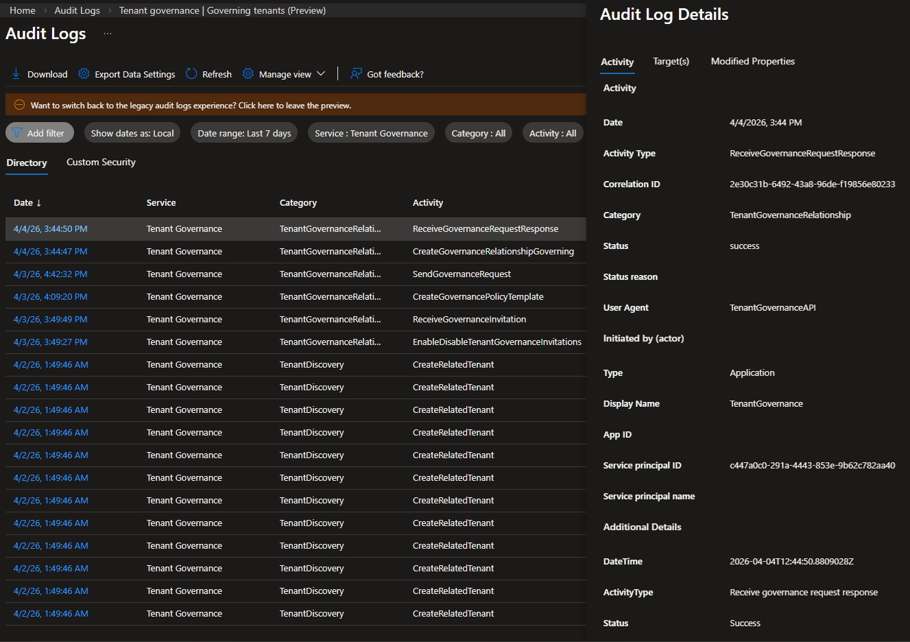 Za razliku od UTCM pregleda, pretpregled upravljanja stanarima ima odgovarajuću podršku za reviziju i možete pronaći odgovarajuće događaje u Entrinom dnevniku revizija. Za najbolje iskustvo filtrirajte zapis prema Servis vrijednost od Upravljanje stanarima. Na snimci zaslona u nastavku možete vidjeti unose revizijskog dnevnika za svakog od otkrivenih povezanih stanara, mijenjanje postavke poziva, konfiguriranje zadanog predloška i sve faze uspostavljanja odnosa upravljanja putem tijeka u tri koraka.
